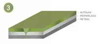 Op Afb.2 ziet u een vergroting van een opgevulde autokras. De kras wordt eerst goed ontvet en gereedgemaakt voor opvullen. Om de kleur die exact bij de auto past te bepalen, wordt een universeel met meer dan 700 kleuren kleurregistratiesysteem gebruikt. Nadat de kleur van de autolak bepaald is, wordt de kras opgevuld met de speciale verf. Deze wordt gedroogd met een infraroodlamp, waardoor de verf gelijkmatig droogt en goed uithardt voor een duurzame opvulling en bescherming. Wanneer de verf gedroogd is, wordt de overtollige opvulling die boven de kras uitsteekt met zeer fijn schuurpapier verwijderd. Zie Afb.3
