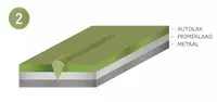 Op Afb.2 ziet u een vergroting van een opgevulde autokras. De kras wordt eerst goed ontvet en gereedgemaakt voor opvullen. Om de kleur die exact bij de auto past te bepalen, wordt een universeel met meer dan 700 kleuren kleurregistratiesysteem gebruikt. Nadat de kleur van de autolak bepaald is, wordt de kras opgevuld met de speciale verf. Deze wordt gedroogd met een infraroodlamp, waardoor de verf gelijkmatig droogt en goed uithardt voor een duurzame opvulling en bescherming. Wanneer de verf gedroogd is, wordt de overtollige opvulling die boven de kras uitsteekt met zeer fijn schuurpapier verwijderd. Zie Afb.3